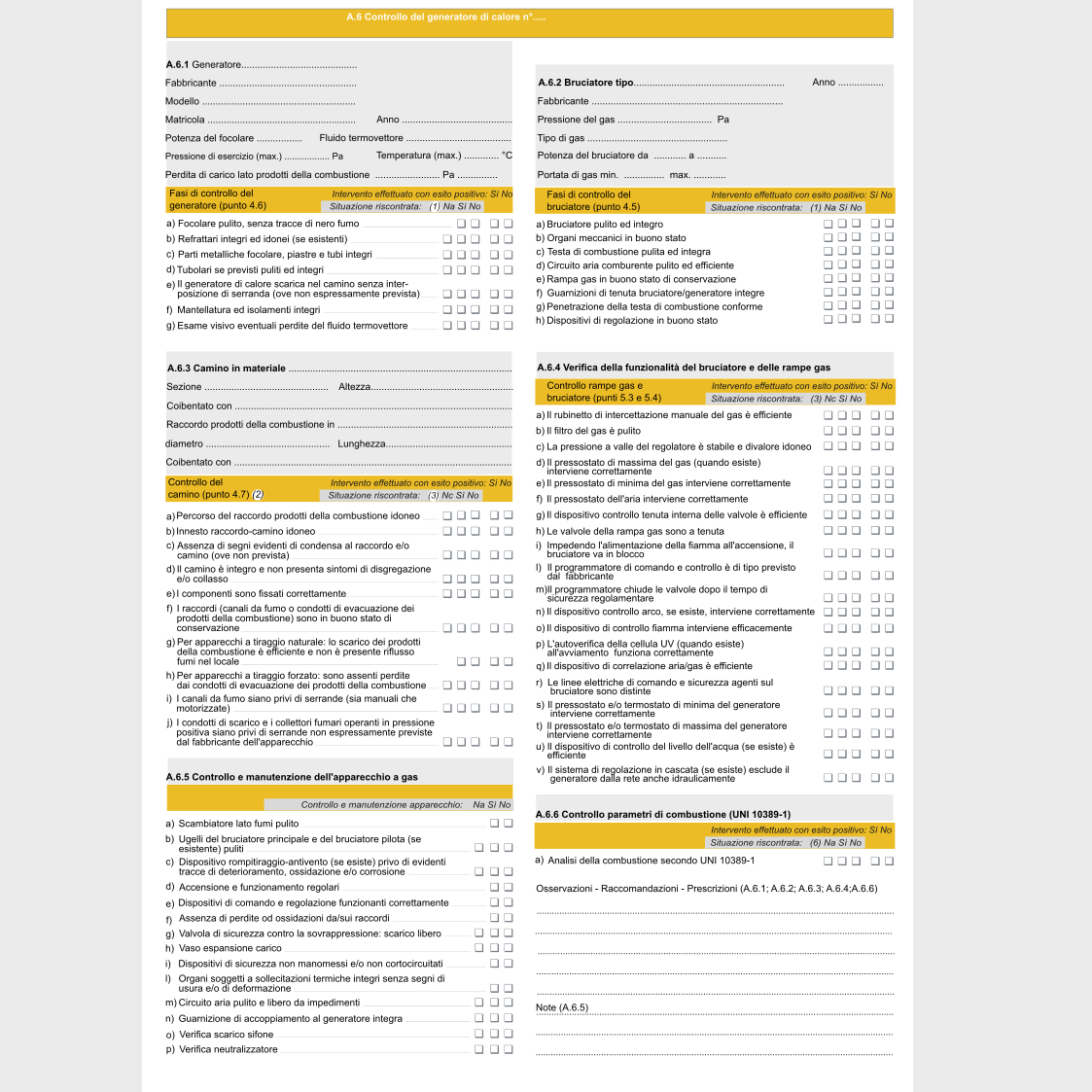 Aggiornato alla norma UNI 10435:2019, permette di documentare il controllo e manutenzione sugli apparecchi alimentati a gas di portata termica nominale superiori ai 35 kW.